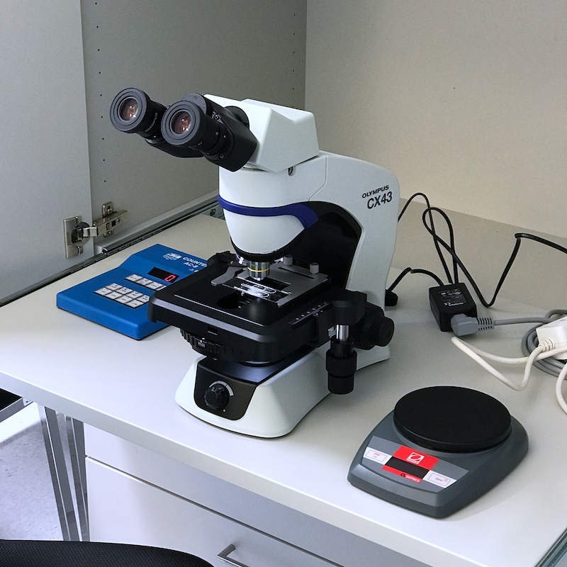 - Für die Bestimmung der Morphologie wird ein 100x Objektiv benötigt. Bei dieser Vergrößerung muss mit Immersionsöl gearbeitet werden, es ist also ein sog. “Öl-Objektiv”.