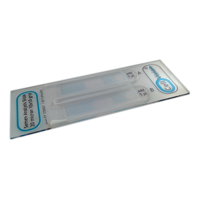 Der Typ niederländischen Laborhandbuch für Post-Vasektomie-Tests erwähnt wird und das untersucht werden sollte, um statistisch sicher über den Erfolg oder Misserfolg der Vasektomie-Operation zu entscheiden. POST VASECOMY ist speziell für die Zählung sehr geringer Spermienzahlen konzipiert. Die gerasterte Fläche hat die Abmessung von 10 x 5 mm und beträgt somit 50mm2. Multipliziert mit 0,02 (die Tiefe in mm) beträgt das Gesamtvolumen der Probe innerhalb der Gitterfläche genau 1µl. Dieses 1µl der zu beurteilenden Probe (natives verflüssigtes Sperma) ist das Volumen, das im